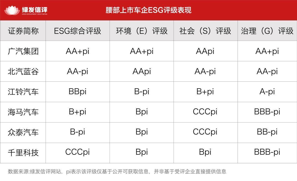 根据绿发信评评级体系(通常80分以上对应AAA至AA+级,40分以下多对应B级及以下),本次评级的六家车企中无AAApi级企业,广汽集团获得最高AA+pi评级;北汽蓝谷获得AA-pi评级;江铃汽车获得BBpi评级;海马汽车获得B+pi评级;众泰汽车获得B-pi评级;千里科技获得CCCpi评级。