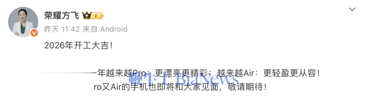 据悉,1月4日,荣耀预热了一款“既Pro又Air”的新机,据爆料该机型为荣耀Magic8Air,将搭载天玑9500旗舰芯片,机身厚度控制在5-6mm区间,同时内置超5000mAh大电池。