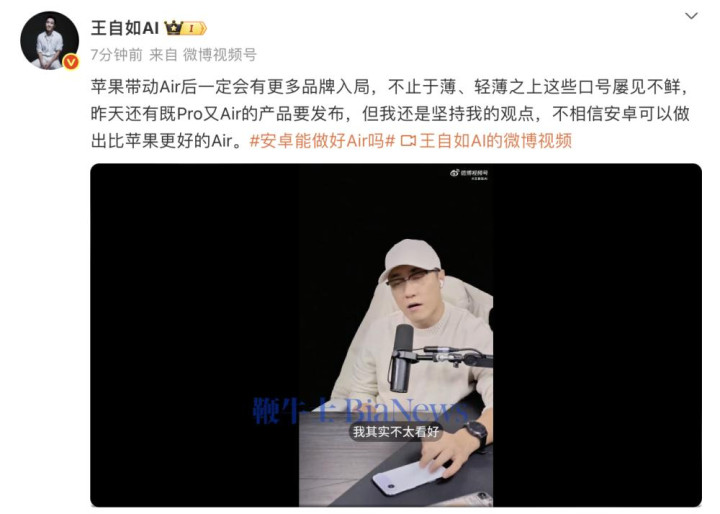 王自如在视频中表示,iPhone17Air的出现一定会在手机行业带动起跟进的热潮,因为目前Air系列产品缺品类、缺概念,而苹果在这方面有很强带动能力。